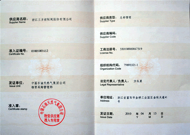 浙江三方集團有限公司下屬公司ayx.com于2010年4月正式通過中國石油天然氣集團公司審核取得調(diào)節(jié)閥產(chǎn)品一級供應(yīng)商證書。
